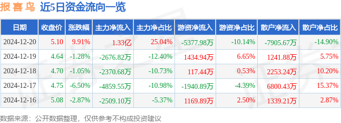 近5日资金流向一览见下表: